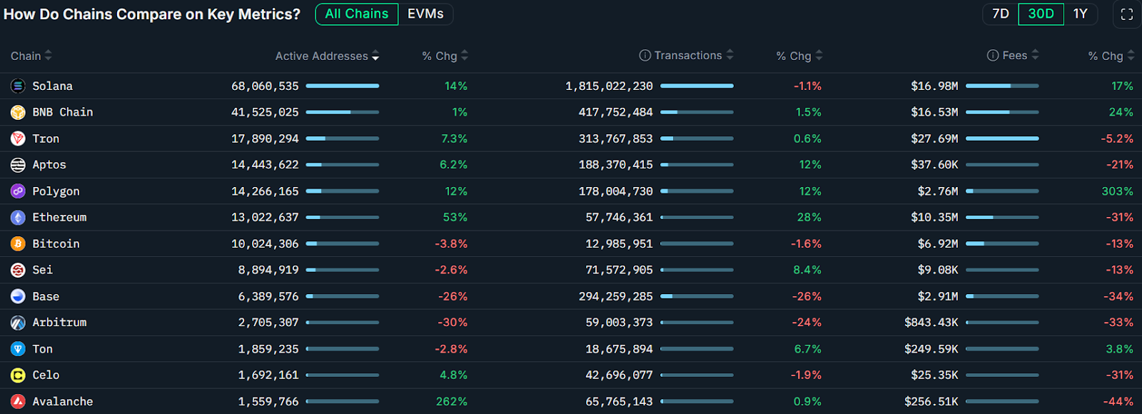 Solana’s lead among the chains can be attributed to its activity, as Solana was the most-used network, with over 68 million active addresses during the past 30 days, up 14%, according to crypto intelligence platform Nansen.