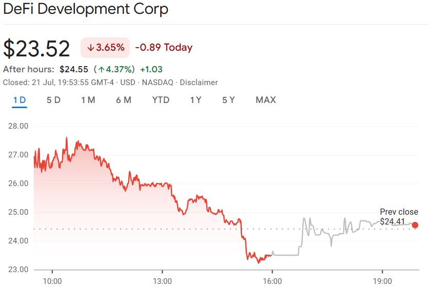 The latest acquisition and Solana’s rally failed to boost the price of DeFi Development Corp’s stocks which fell 3.65% on Monday to trade at $23.52. However, it recovered slightly in after-hours trading to $24.55.
