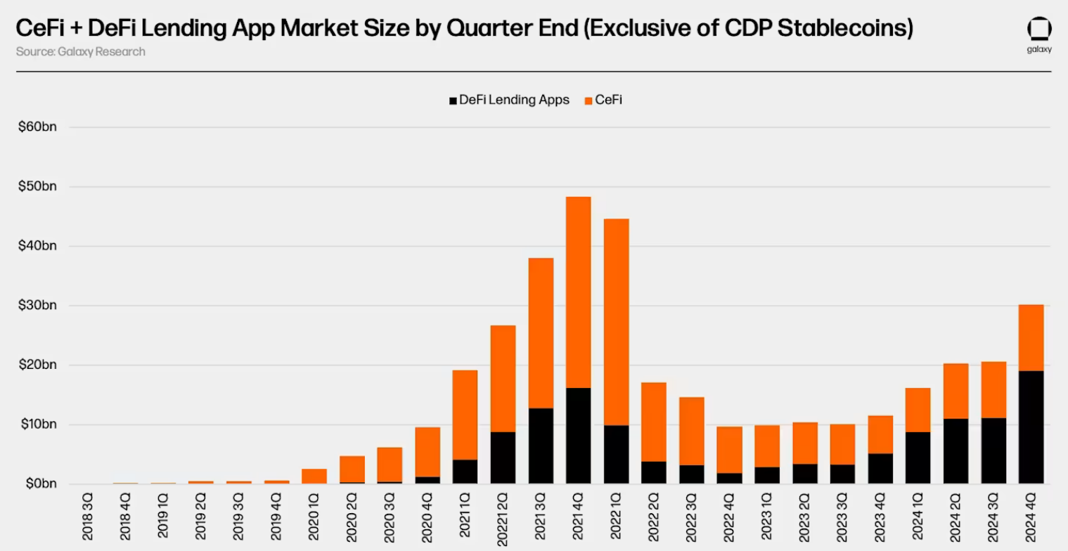 DeFi-based crypto lending accounted for around 65% of the total market by the end of 2024 and has increased or maintained its market share against centralized lenders every quarter since Q4 2022, an April report from crypto investment firm Galaxy Digital showed.