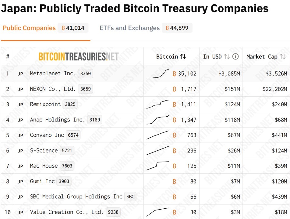 Top 10 Japanese Bitcoin Treasury firms. Source: BitcoinTreasuries.NET