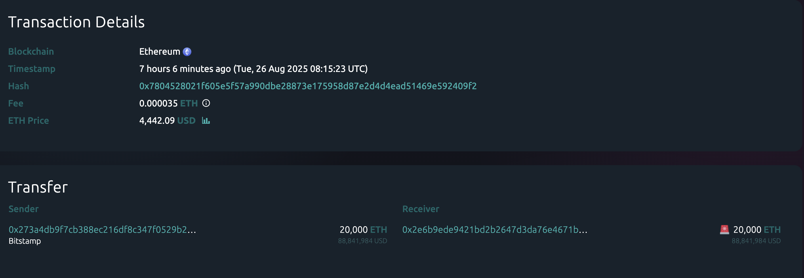 On Tuesday, crypto exchange Bitstamp sent 20,000 ETH to an unknown wallet, according to Whale Alert data. That indicates an exchange-to-self-custody flow typically associated with accumulation.
