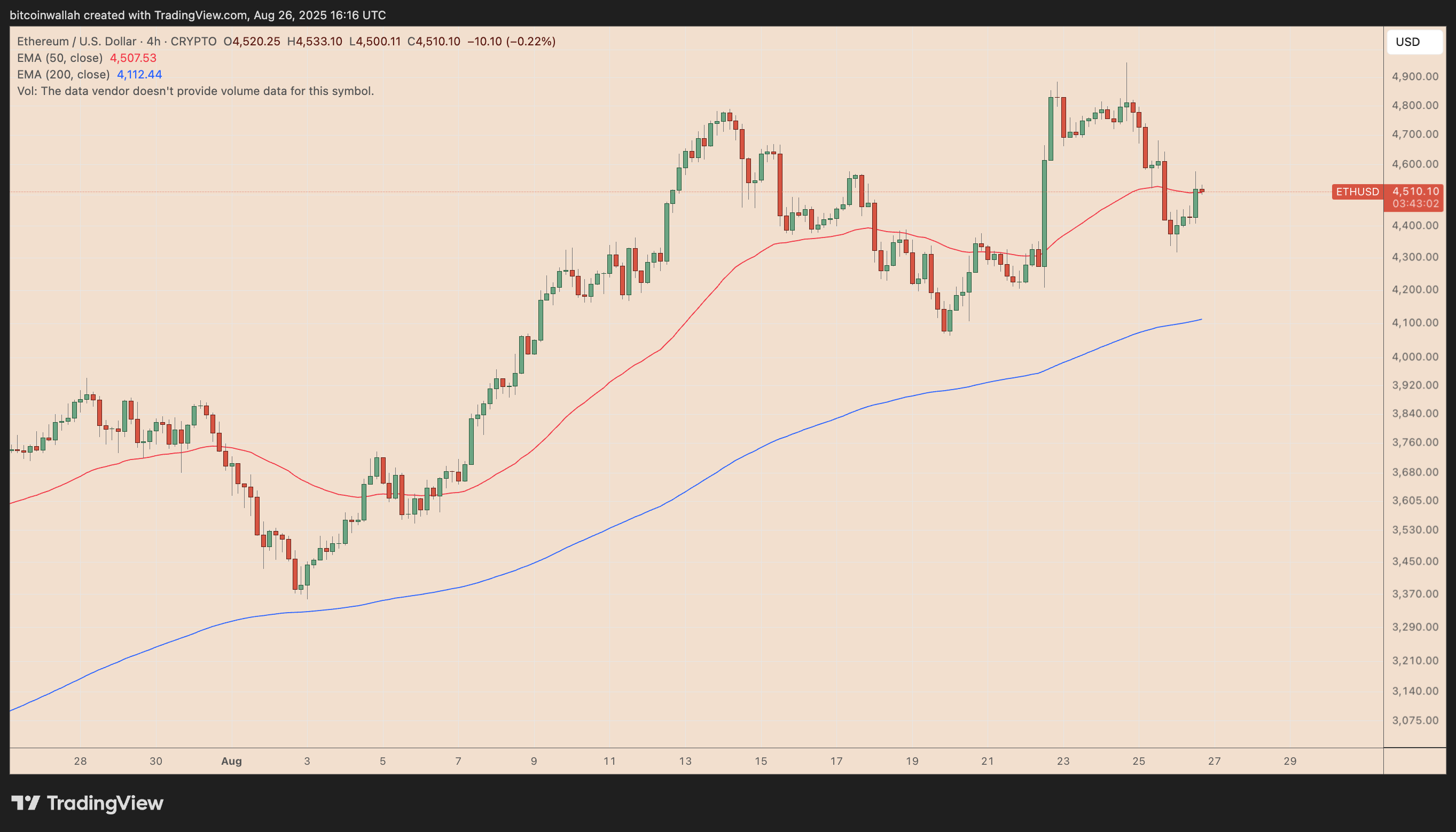 Ether has dropped more than 13% since Sunday, slipping from above $5,000 to around $4,315, a decline the whale appears to have treated as a buying opportunity.