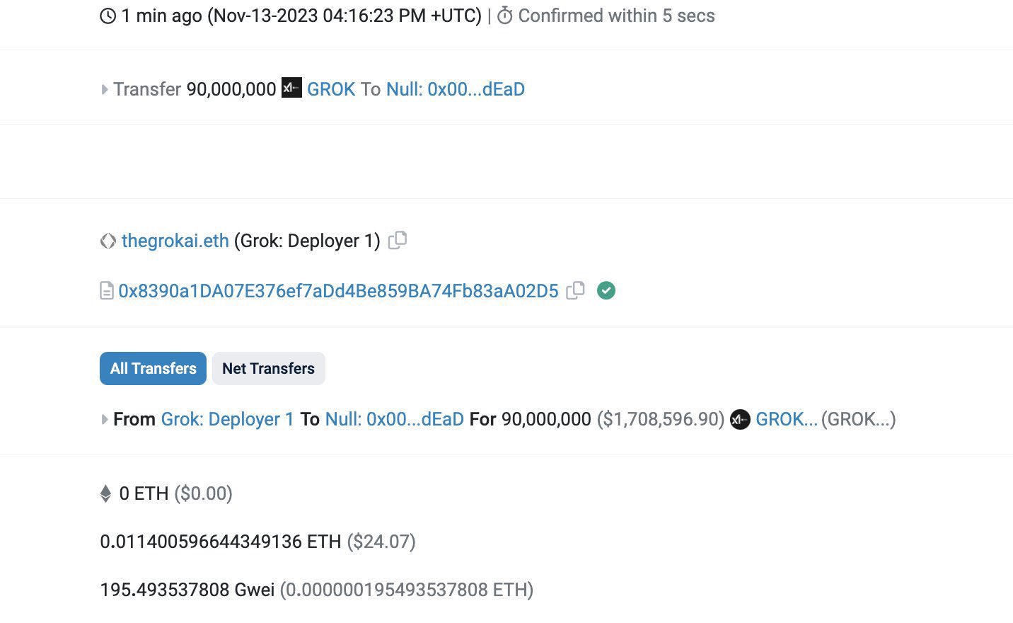 The X account for the GROK token claimed in a Nov. 14 post that the development team had burned all of the tokens from the deployer address, some 180 million GROK worth roughly $2 million at current prices.