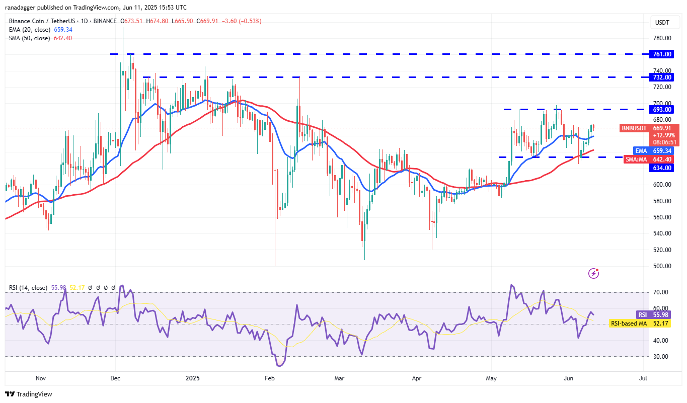 BNB (BNB) rose above the 20-day EMA ($659) on June 9, and the bulls are trying to push the price toward the $693 resistance.