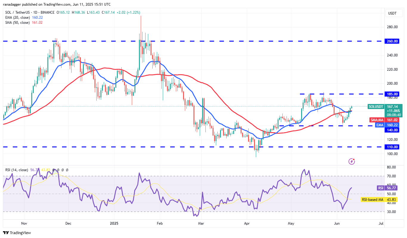 Solana (SOL) broke above the moving averages on June 9, suggesting the formation of a range between $140 and $185.