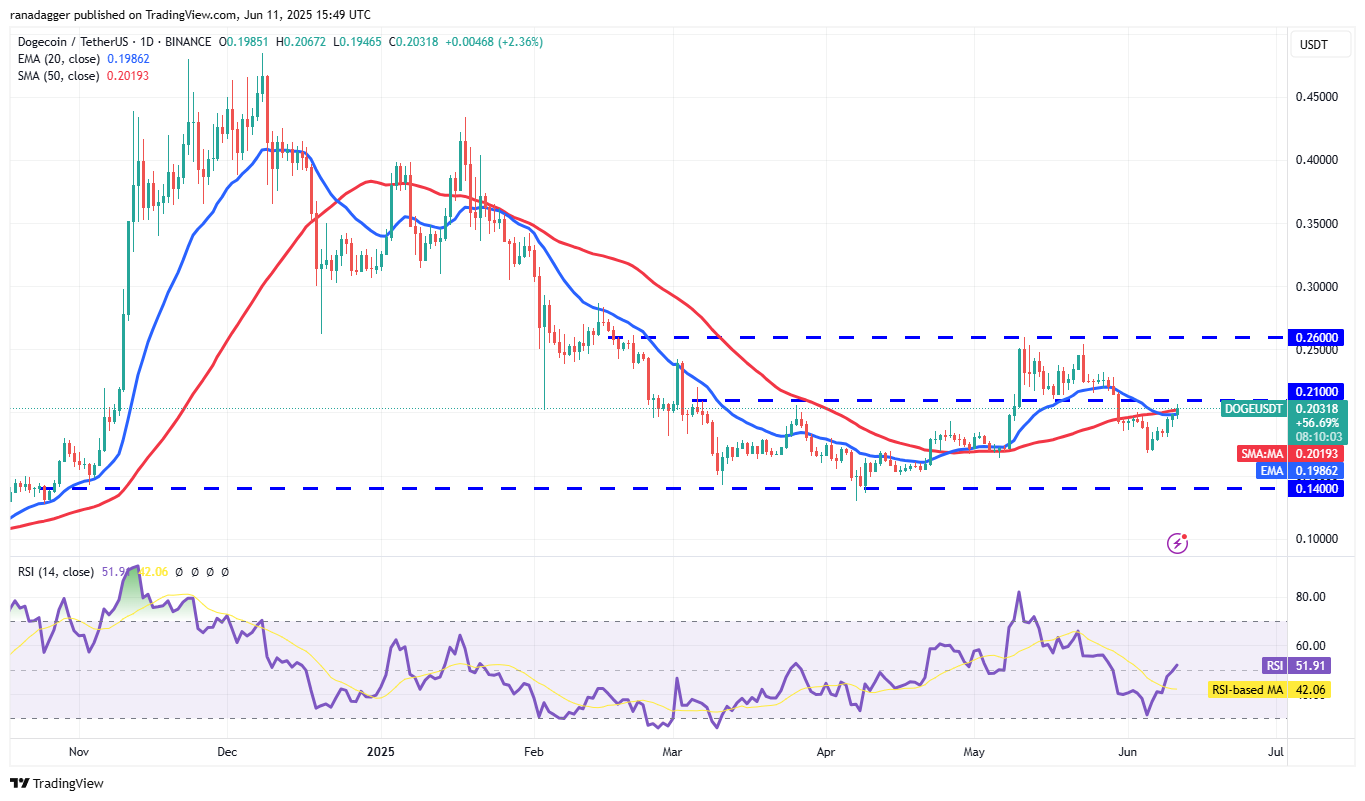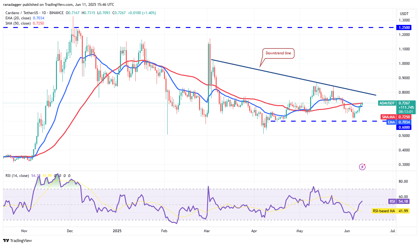 Cardano (ADA) rose above the 20-day EMA ($0.70) on June 9, and the bulls are trying to strengthen their position by pushing the price above the 50-day SMA ($0.72). If they manage to do that, the next stop could be the downtrend line.