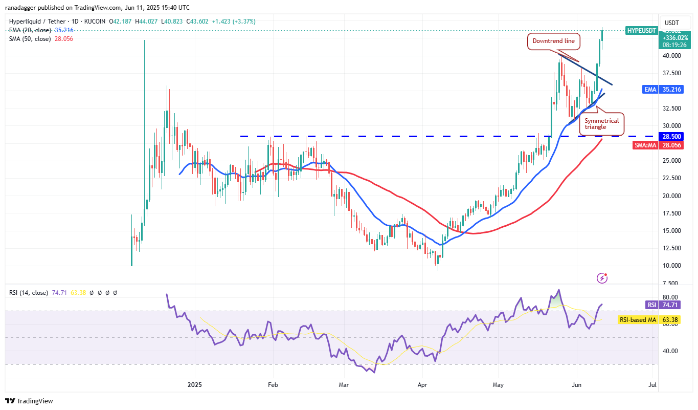 Hyperliquid (HYPE) broke and closed above the symmetrical triangle pattern on June 9, indicating the resumption of the uptrend.