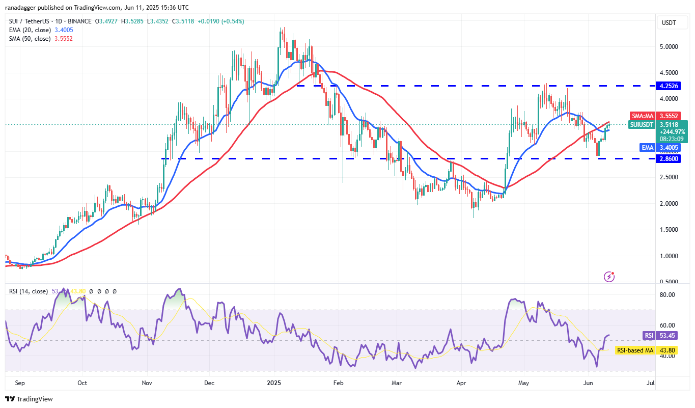 Sui (SUI) pierced the 20-day EMA ($3.40) on June 9, and the bulls are trying to drive the price above the 50-day SMA ($3.55) on June 11.