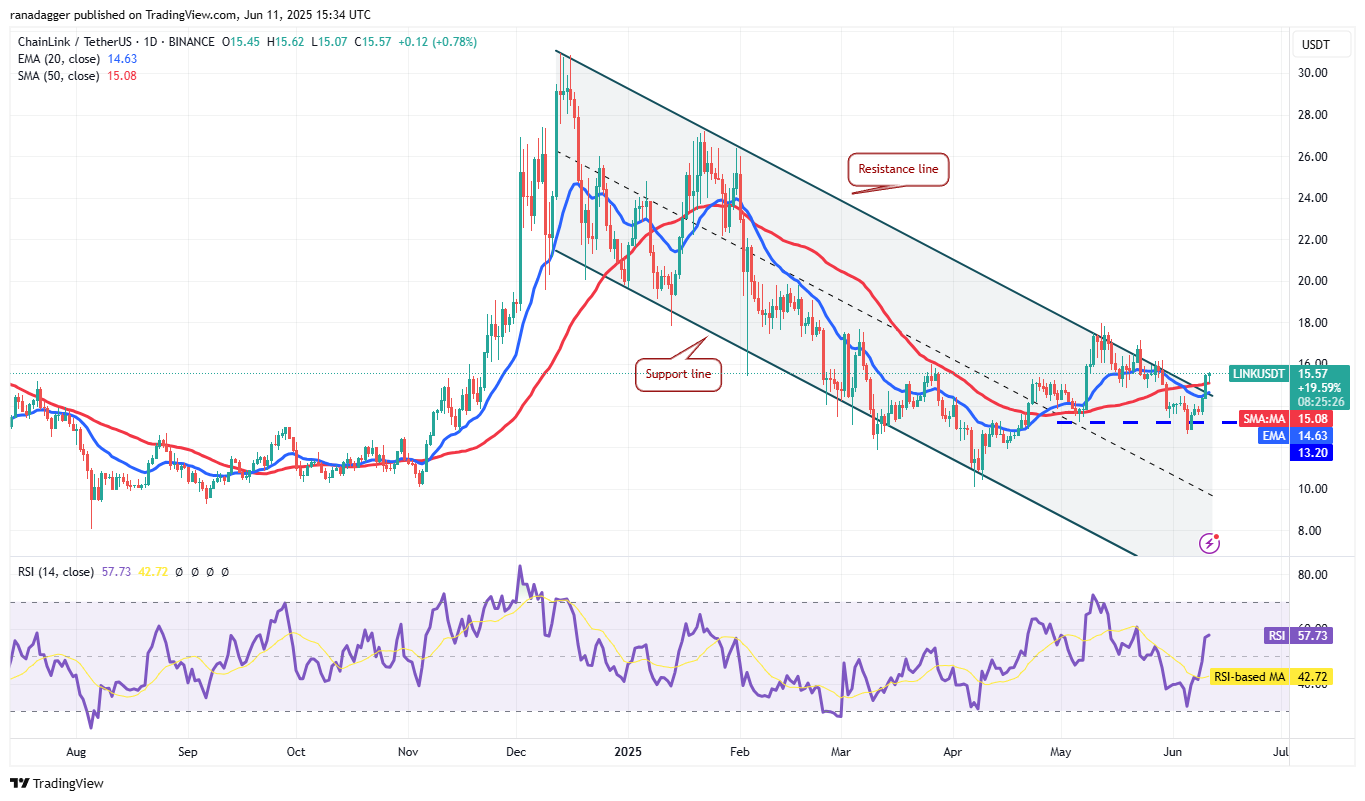 Chainlink (LINK) soared above the resistance line of the descending channel pattern and the moving averages on June 10, signaling that the bears are losing their grip.