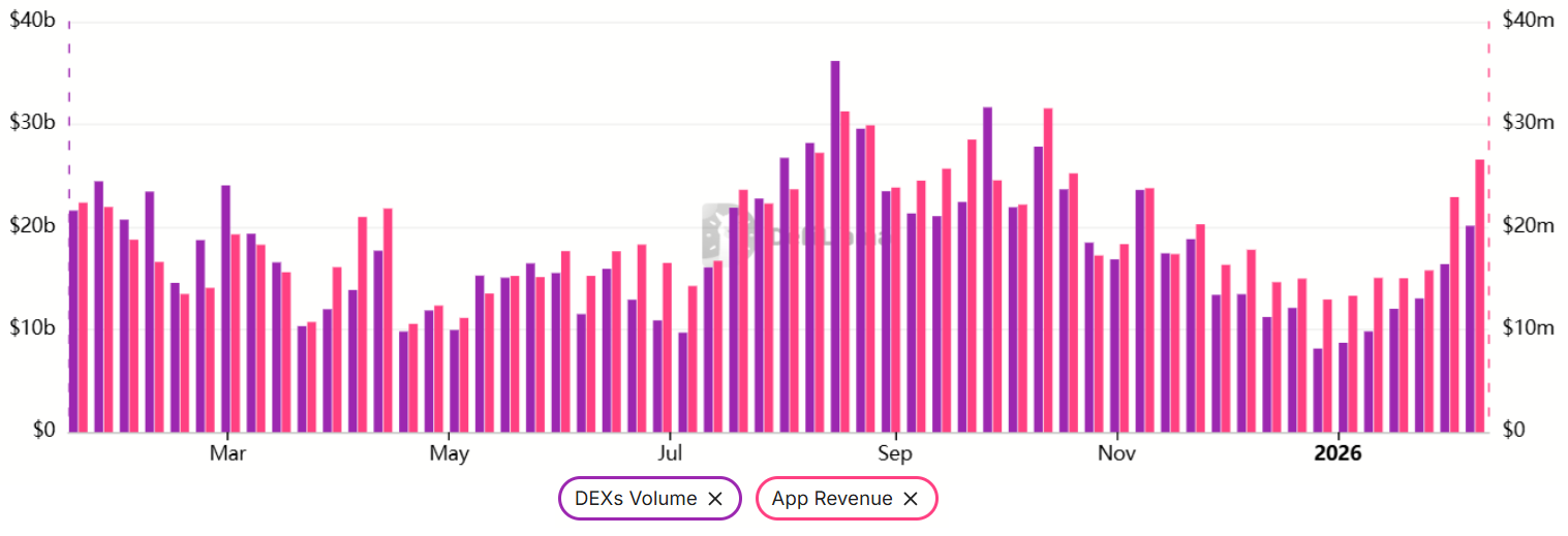 Weekly decentralized exchange volume doubled to $20 billion, narrowing the revenue gap with Solana.