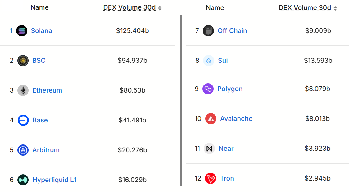 Blockchains ranked by 30-day DEX volumes, USD. Source: DefiLlama