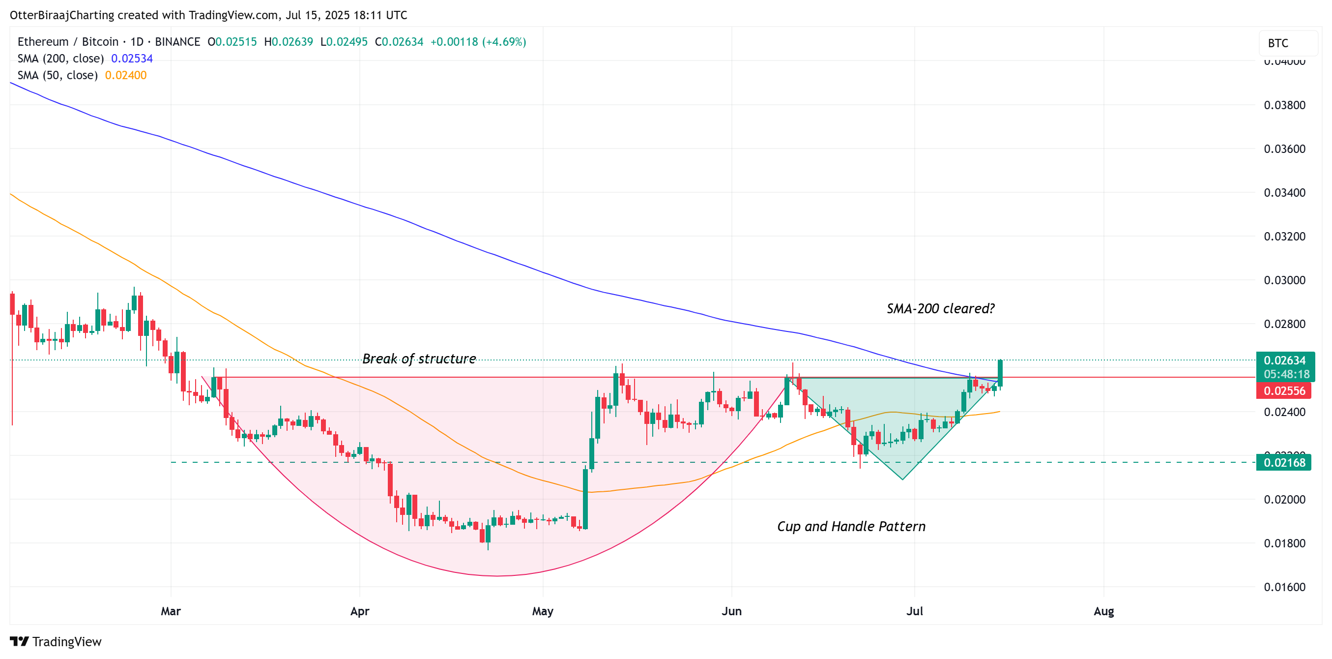 This shift is reflected clearly in the ETH/BTC pair. The one-day ETH/BTC chart has registered a bullish break of structure for the first time since May 24, signaling a trend reversal. Notably, ETH/BTC also reclaimed a position above its 200-day moving average for the first time in a year, signaling medium- to long-term strength.