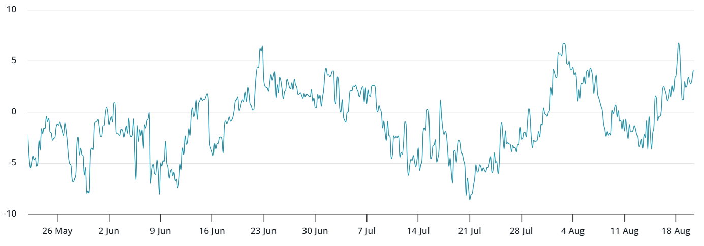 ETH’s annualized futures premium stayed above the neutral 5% threshold throughout the decline, signaling confidence. Monthly futures typically trade higher than spot markets to reflect the longer settlement period, yet the last meaningful bullish signal from this metric came in January. Even the 100% ETH rally between July 1 and Aug. 13 could not fully restore trader optimism.