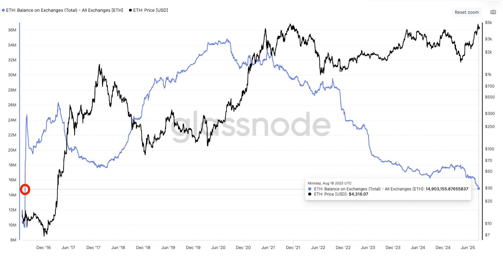 ETH balances on exchanges have dropped to nine-year lows, falling to 14.9 million ETH for the first time since July 2016, Glassnode data shows.
