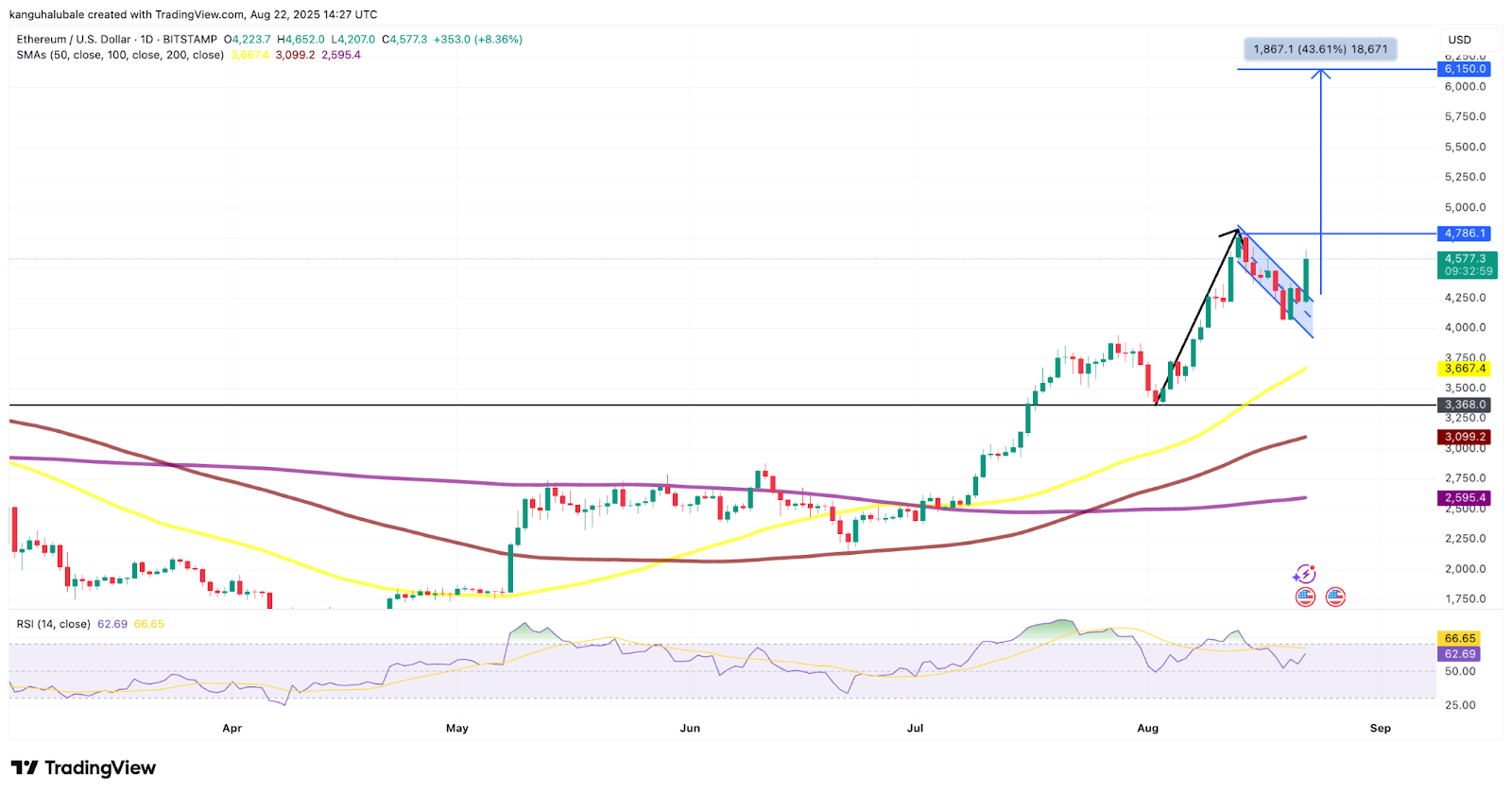 Ether’s (ETH) price displayed strength at the Wall Street open on Friday, rising 13% to $4,788 following Federal Reserve Chair Jerome Powell’s Jackson Hole speech.