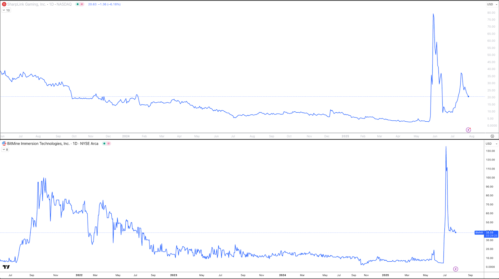 Despite a dedicated commitment to stockpiling ETH, SharpLink Gaming’s SBET and Bitmine Immersion Tech’s BMNR stock are down 36.4% and 14.52% over the past week, but the decline comes after each stock had a respective 565% and 381% rally over the past three months.
