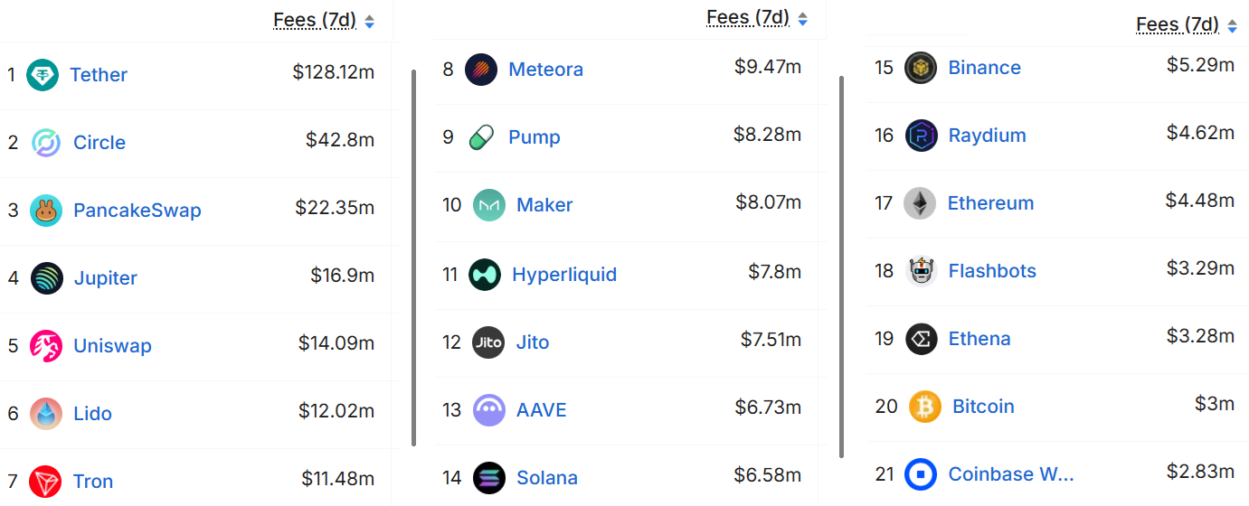 Top protocols ranked by 7-day fees, USD. Source: DefiLlama