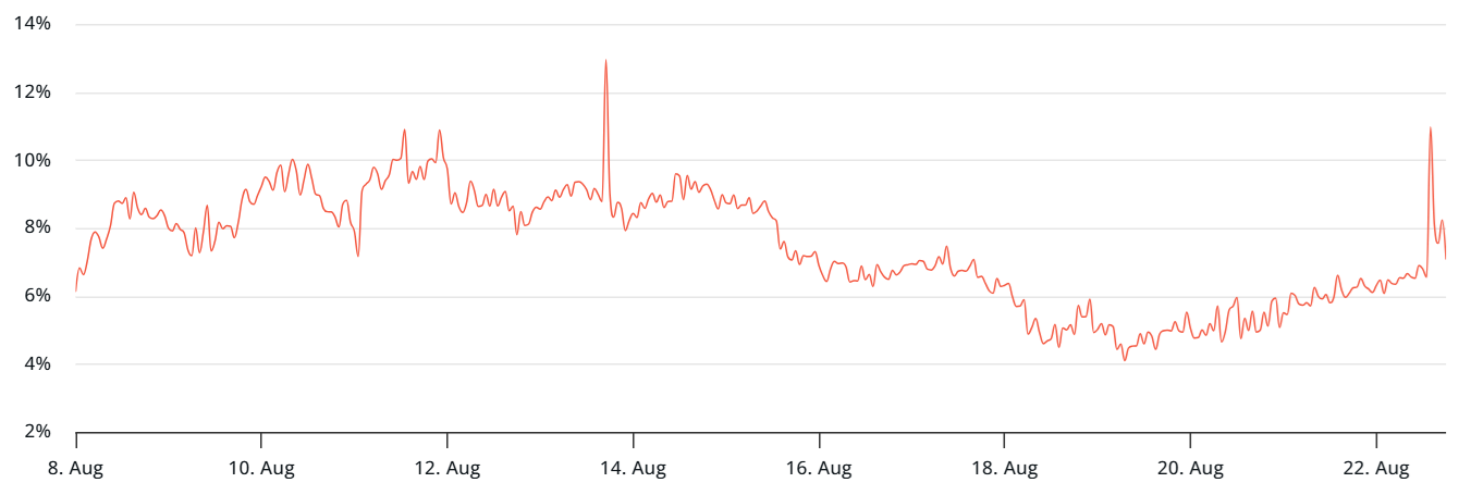 While onchain metrics highlight growing activity, futures markets reveal a more cautious stance. ETH futures contracts typically trade at a 5% to 10% annualized premium over spot prices to account for settlement delays. At present, the monthly futures premium stands at 7%, up from a bearish 4% earlier in the week.