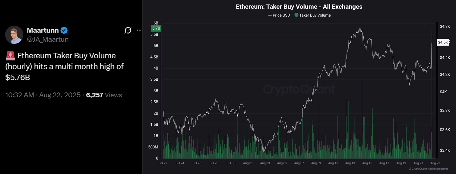 According to X user JA_Maartun, futures buyers have not shown this level of aggressiveness in more than a month. Analytics firm CryptoQuant tracks these dynamics by measuring the volume of buy orders filled against sellers with pending offers, a signal of rising conviction.