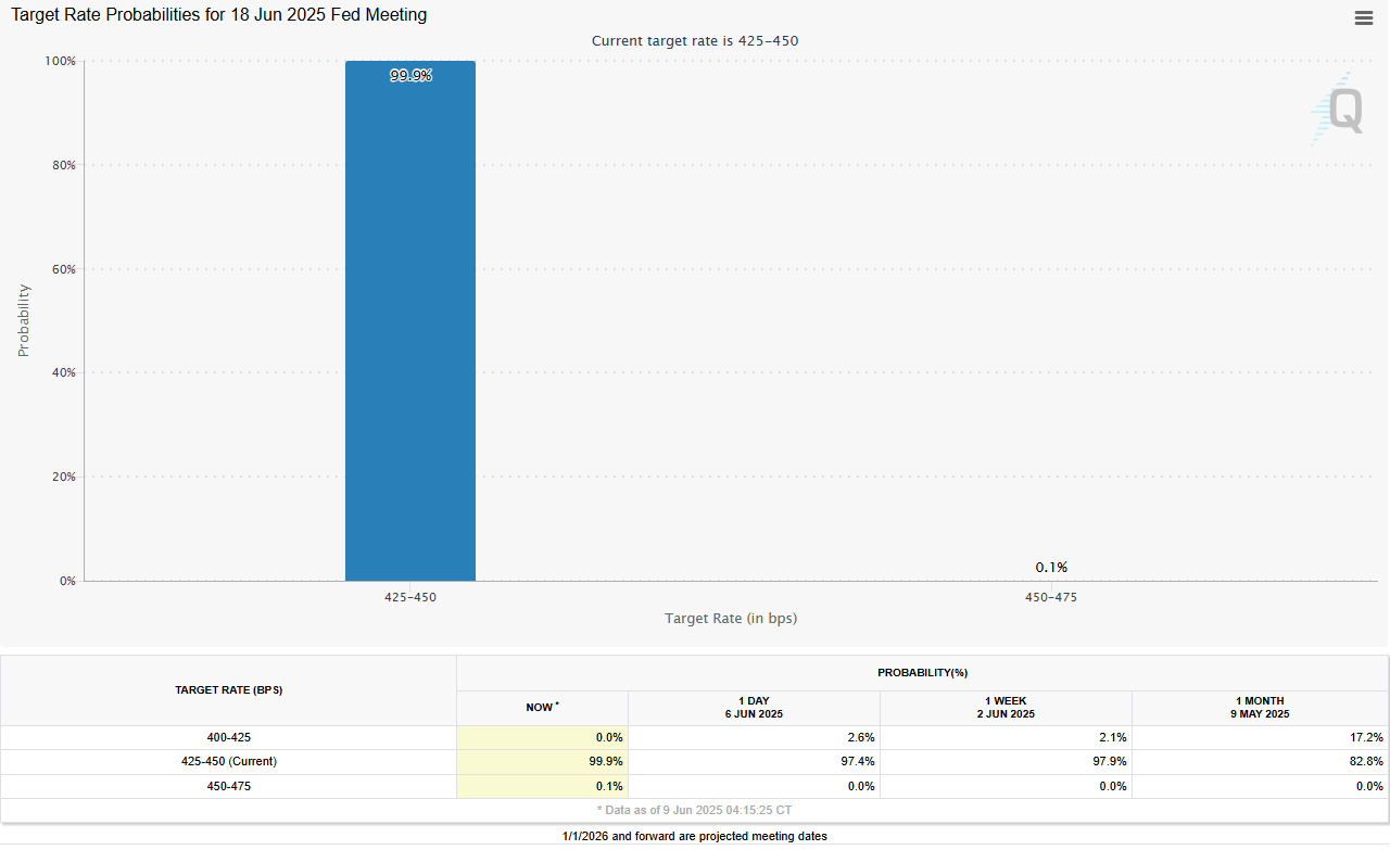 Markets are currently pricing in a 99.9% chance that the Fed will keep interest rates steady during the next FOMC meeting, according to the latest estimates of the CME Group’s FedWatch tool.