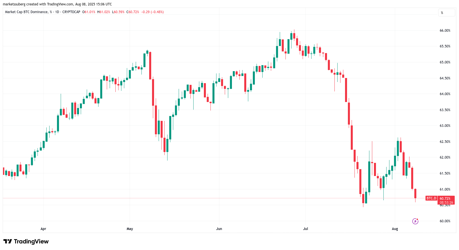 Bitcoin’s share fell below 60.7% on the day, again dicing with a critical support level.