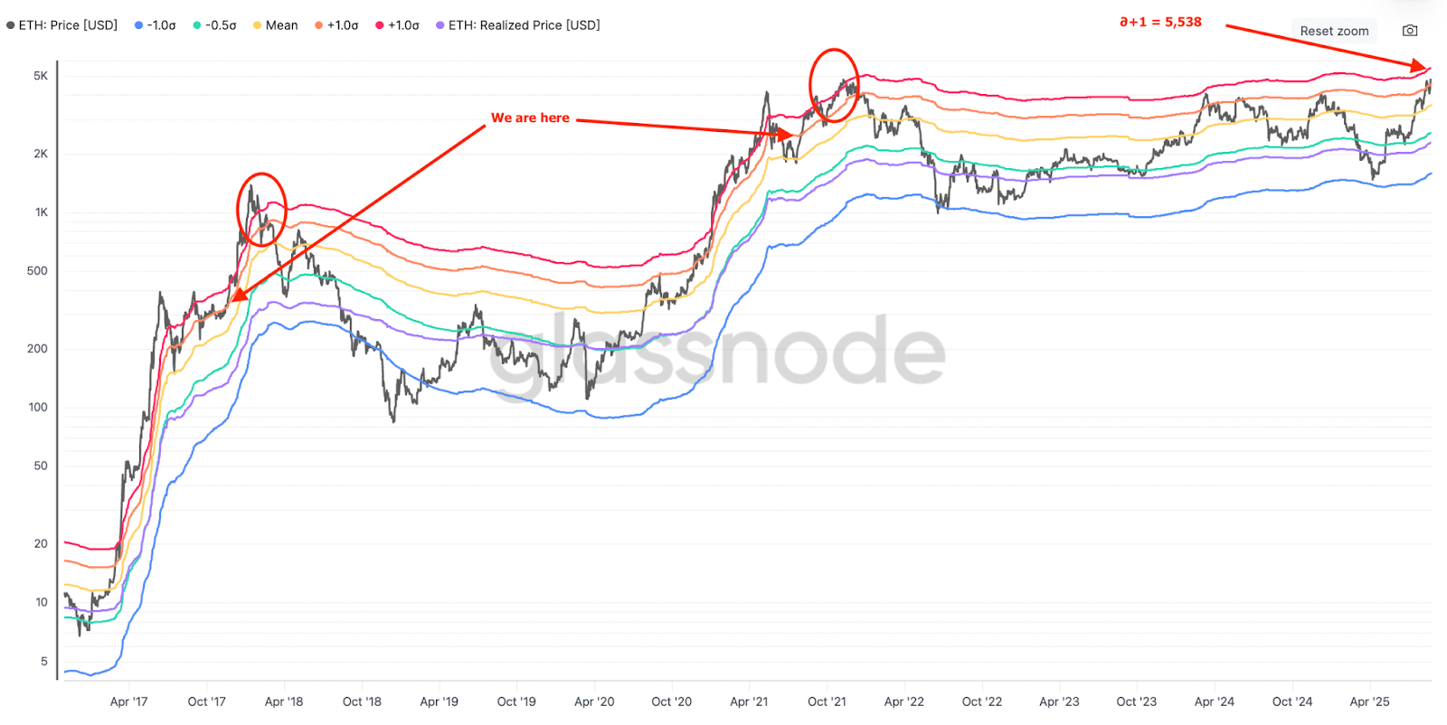 This zone is particularly significant because it suggests ETH has not yet reached the euphoric phase (blue) typically associated with cycle peaks.