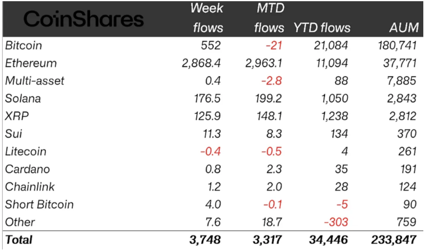Ether continued dominating capital inflows into exchange-traded products (ETPs) last week, according to CoinShares. Inflows into ETH investment products totaled $2.9 billion, marking strong institutional investor appetite for the top altcoin.
