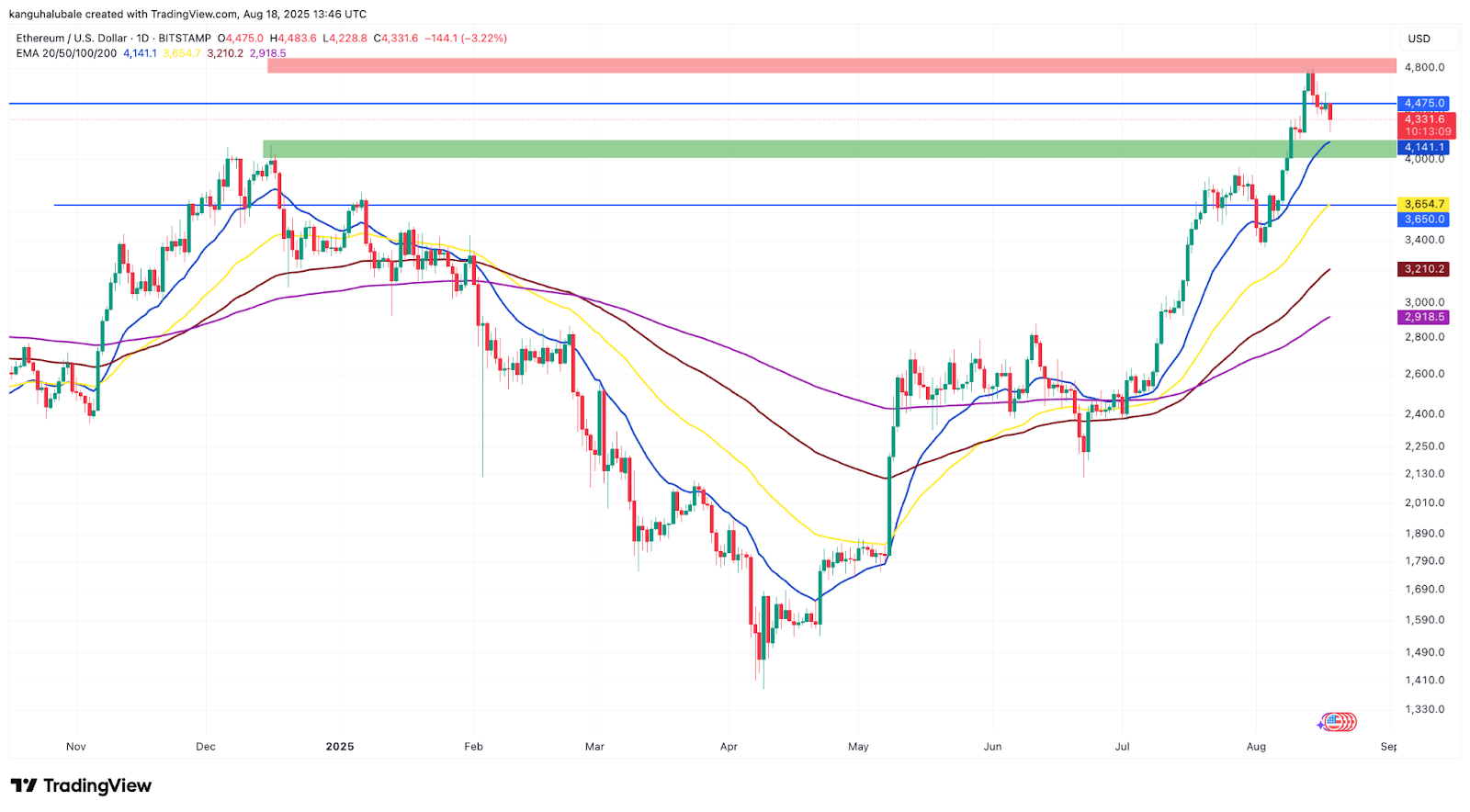 On the upside, the analyst said a weekly close above $4,550 could confirm a breakout into new all-time highs with targets set between $5,000 and $5,800.