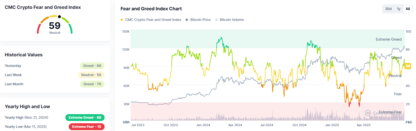 The Crypto Fear & Greed Index shifted from “greed” to “neutral” territory, falling to 59 at the time of writing, down from 68 on Thursday, CoinMarketCap data showed.