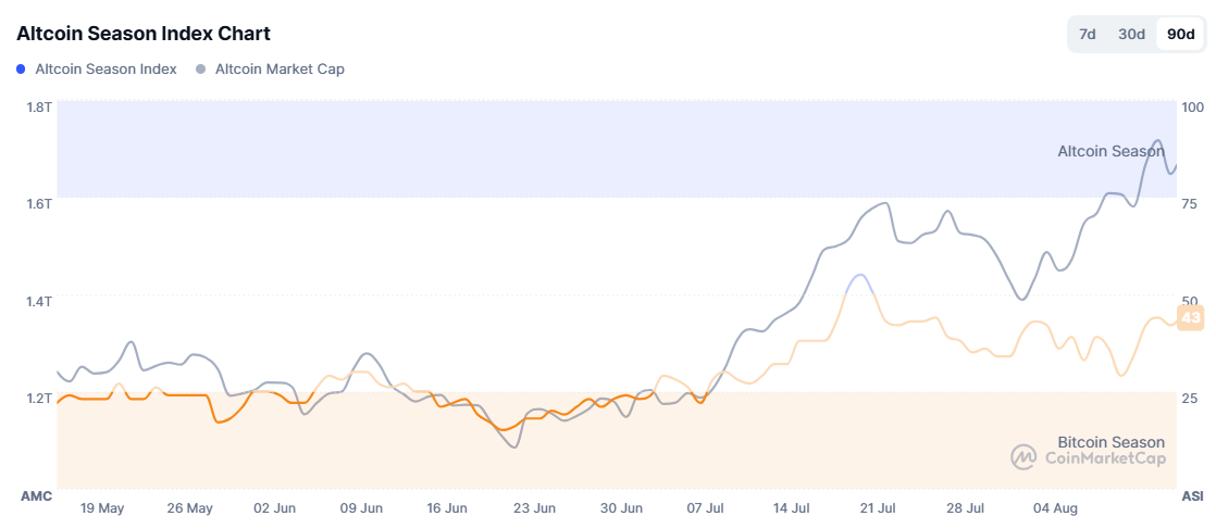 The altcoin season index climbed from 33 to 42 during the past week, but remained below the 75 level, which signals the beginning of the altcoin season, CoinMarketCap data showed.