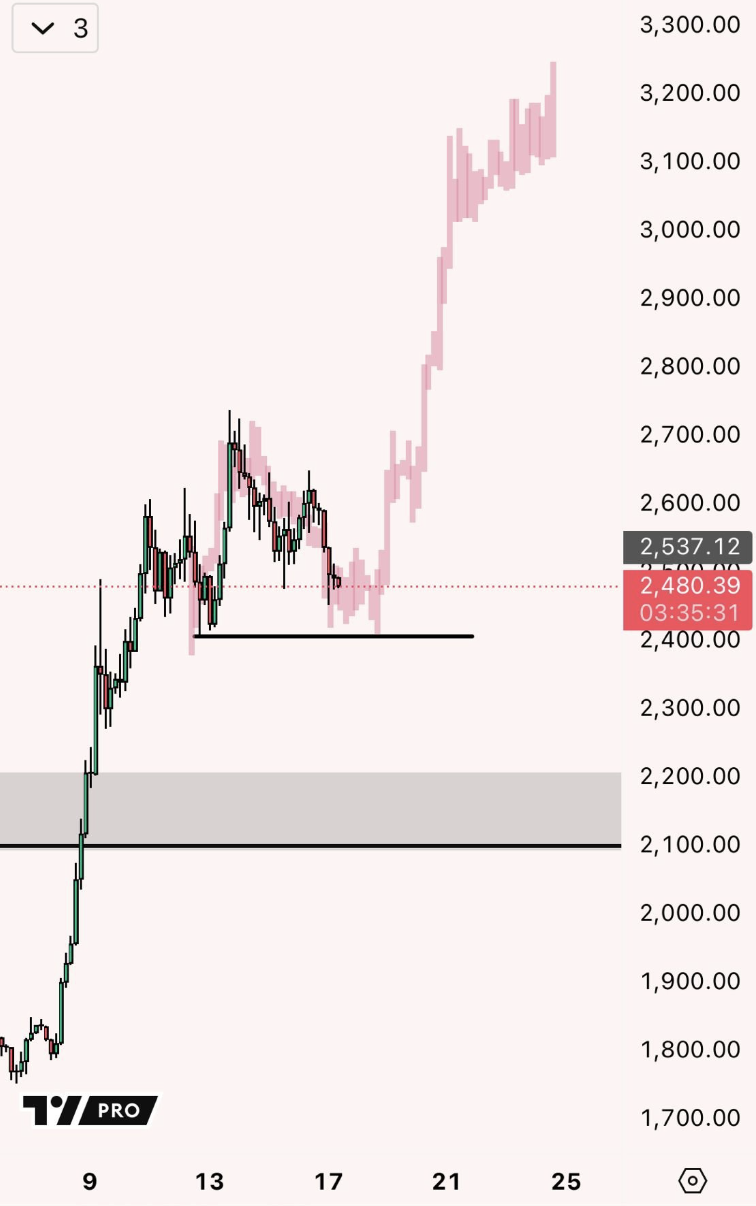 The analyst shared a chart suggesting that the altcoin could continue its retracement to retest $2,400 support before launching another rally toward the $3,000-$3,300 range.