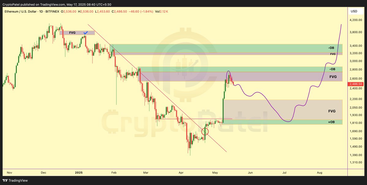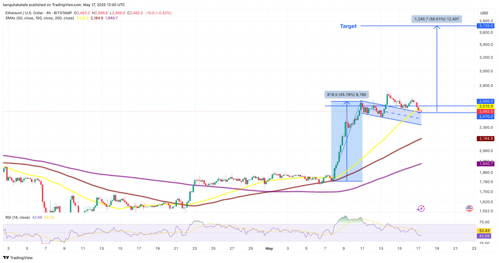 The bull flag was confirmed on May 13 when the price broke above the upper trendline at $2,550. Ether is now retesting the upper boundary of the flag, currently at $2,470, which is acting as immediate support.