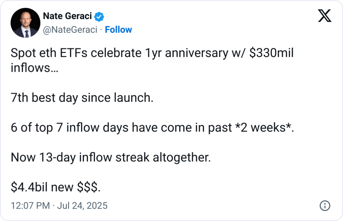 US Ether ETFs marked their first trading birthday by notching their seventh-best day of inflows ever, taking in $332.2 million on Wednesday.