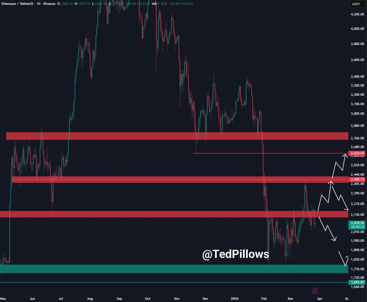 “$ETH has dropped below the $2,100 level,” analyst and trader Ted Pillows said in a Friday X post, adding: