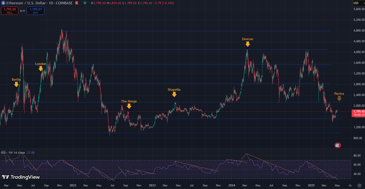 Technically, the setup looks favorable. ETH appears to have already formed a local bottom, with the weekly RSI — often a reliable reverse signal — breaking out of its downtrend on April 20. This marks the end of a correction that lasted since December 2024 and wiped out as much as 66% of ETH’s value. A new uptrend could be underway, but could Pectra be its trigger?