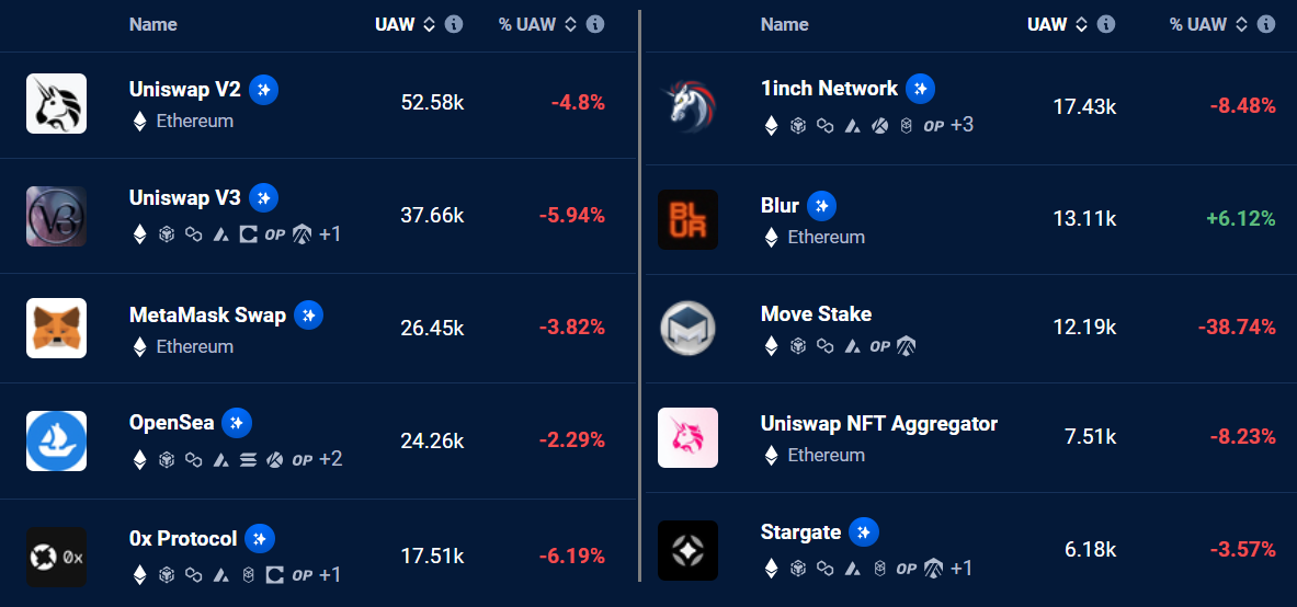 Regrettably, for Ethereum, the drop in TVL is accompanied by decreasing activity in most ecosystem DApps, including the leading DEX, Uniswap, and the largest NFT marketplace, OpenSea. The reduced demand is also evident in the gaming sector, with Stargate showing only 6,180 active accounts on the network.
