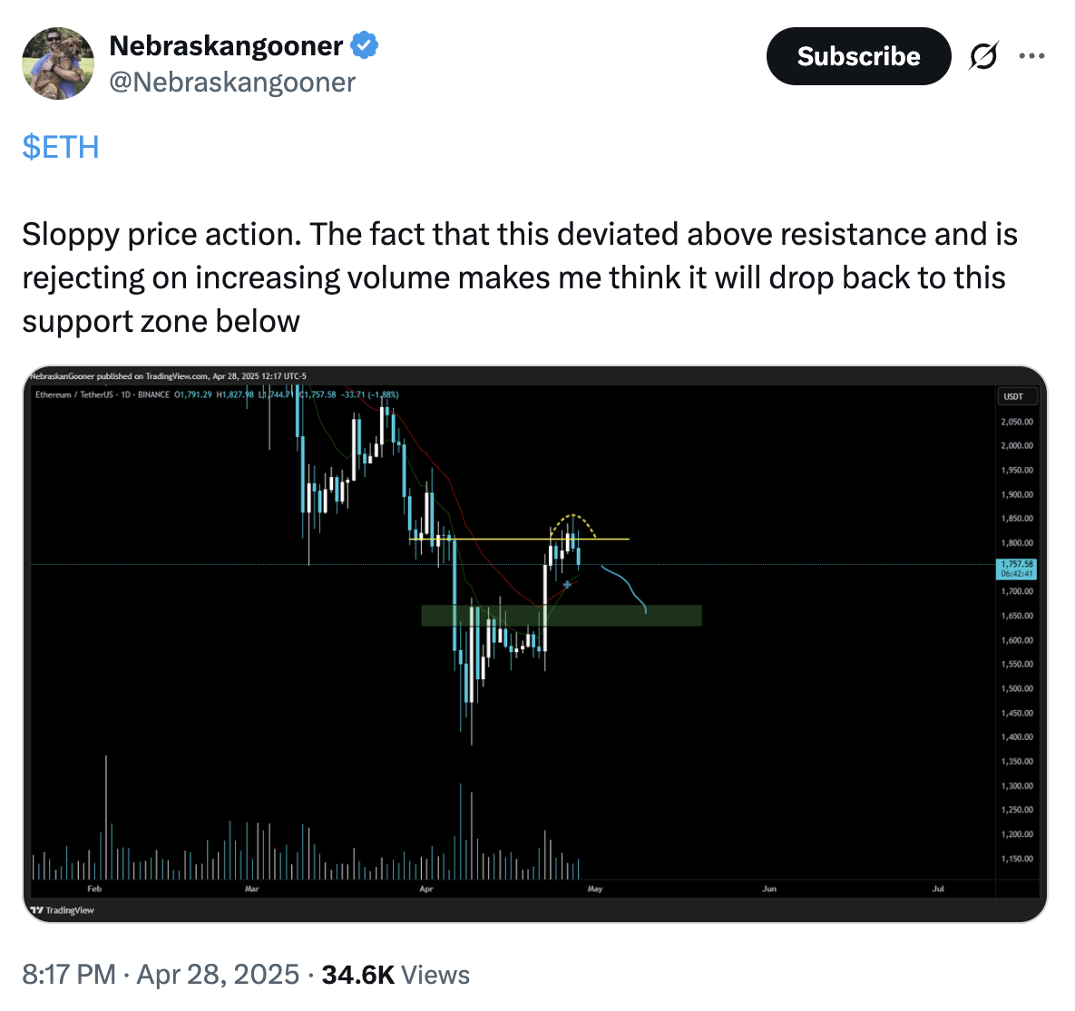 “Once ETH confirms this 4H close above resistance [$1,800], Ether and altcoins will finally get their time to shine,” trader Kiran Gadakh said in an April 29 post on X.
