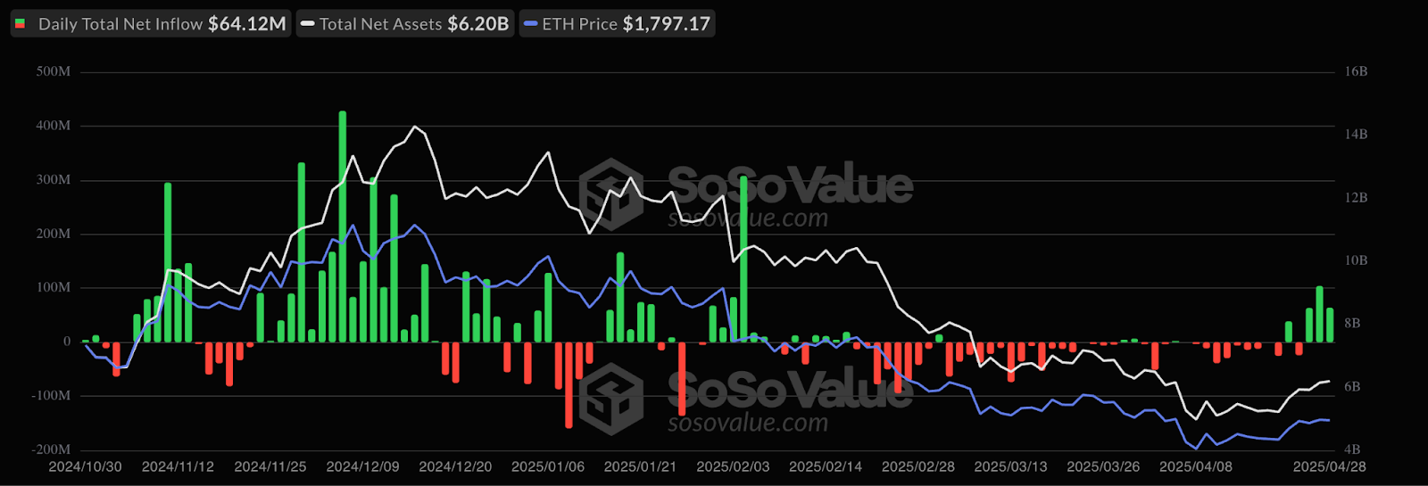 On April 28, Ethereum ETFs saw a net inflow totaling $64.1 million. This followed inflows totalling $151.7 million during the week ending April 25, the highest since February 2025.