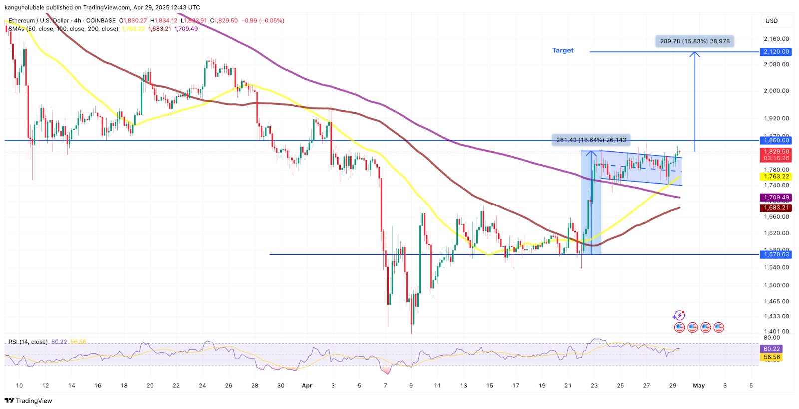 Ether’s (ETH) price rose to a new range high at $1,860 on April 28, its highest value since April 2.