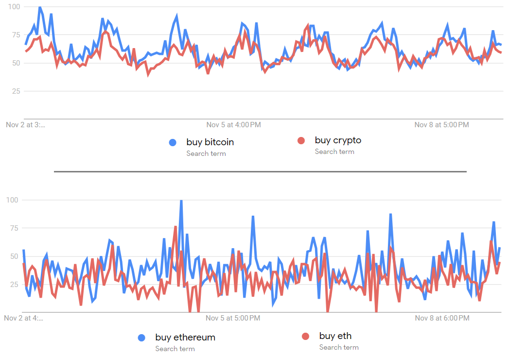 For starters, the Google searches for “Buy Ethereum”, “Buy ETH” and “Buy Bitcoin” have been stagnant for the past week.