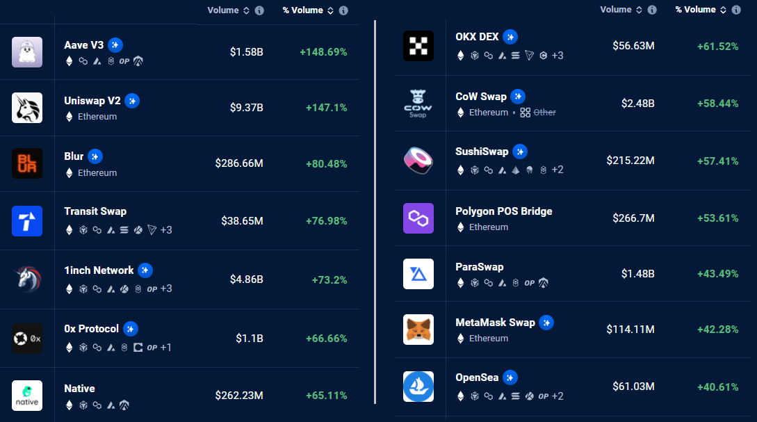 There’s little doubt that Ether bulls got the upper hand regardless of the spot ETF narrative as ETH rallied 24% before the BlackRock news, between Oct. 18 and Nov. 8. This price action reflects a higher demand for Ethereum network, as reflected by the top decentralized applications (DApps) 30-day volumes.