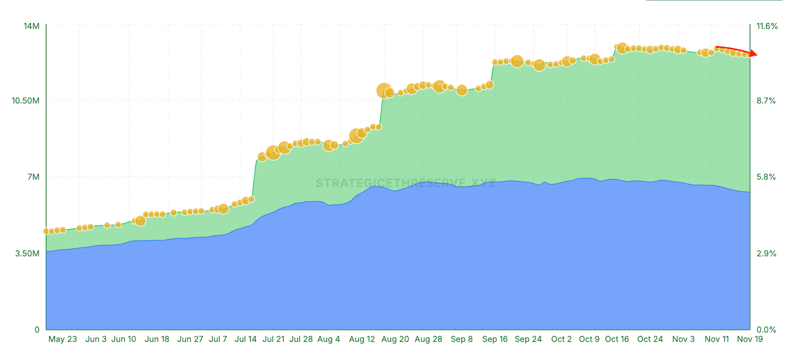 Data from StrategicETHreserve.xyz indicates that collective holdings of strategic reserves and ETFs have dropped by 280,414 ETH since Nov. 11.