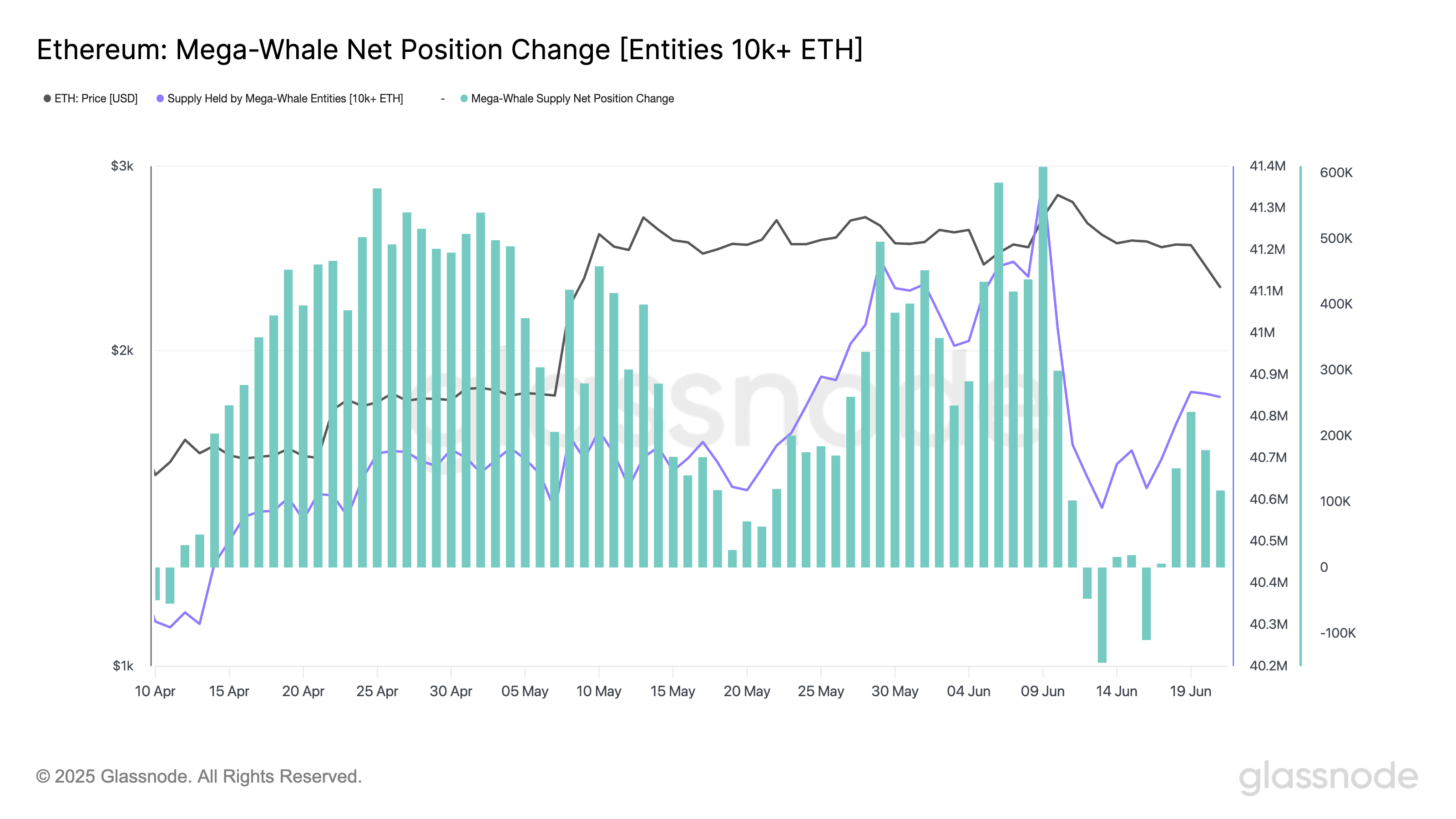 Ethereum mega-whales added over 116,000 ETH on June 21, signaling strong buy-the-dip sentiment.