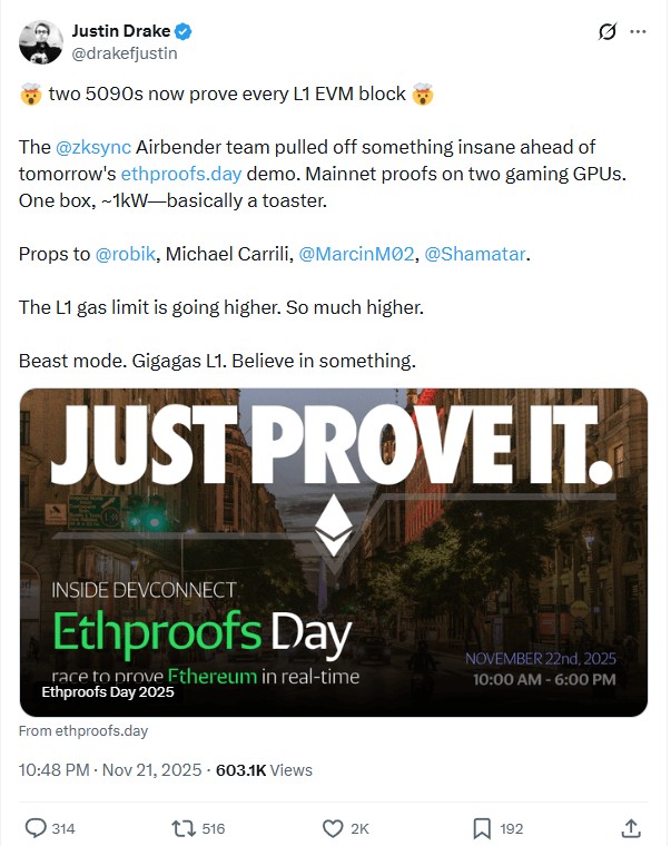 Researcher Justin Drake demonstrated that validating proofs on an old laptop is already possible at EthProofs Day at Devconnect in November. One in 10 validators are expected to make the switch to ZK before the end of the year.