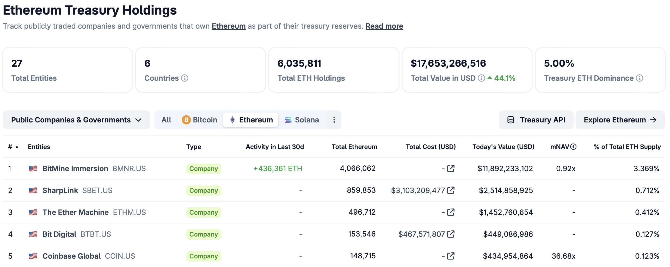 Lee is also chairman of BitMine Immersion Technologies, the leading Ether-focused treasury company that has reported holdings of 4,066,062 ETH, according to CoinGecko data.