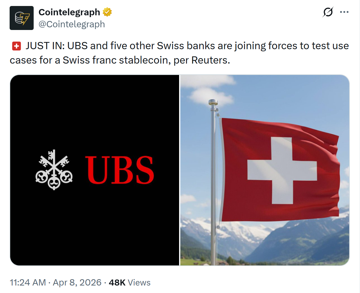 European banks are also moving ahead with stablecoin initiatives. Societe Generale has positioned its stablecoins around cross-border payments, onchain settlement, FX and cash management, while Oddo BHF has launched a MiCA-compliant euro stablecoin. Meanwhile, a consortium of banks, including ING, UniCredit and BNP Paribas is preparing a Swiss-franc stablecoin for the second half of 2026.