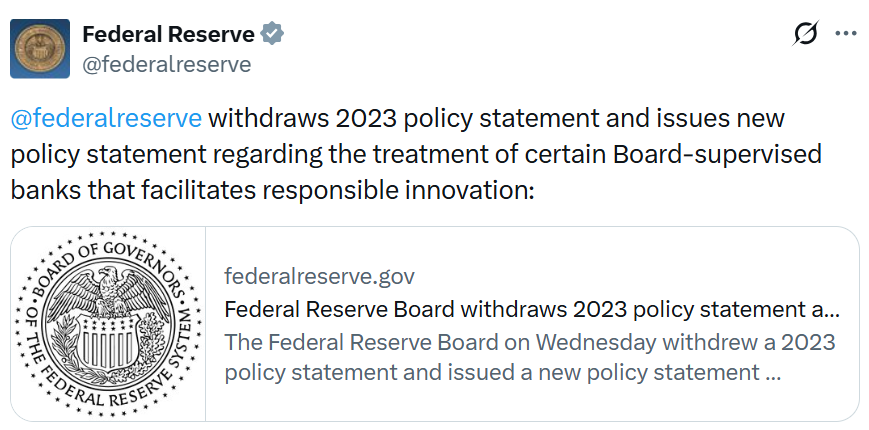 The US Federal Reserve has withdrawn a 2023 guidance that limited how Fed-supervised banks, including uninsured ones, engaged with crypto, as US regulators continue to pivot positively toward digital assets.