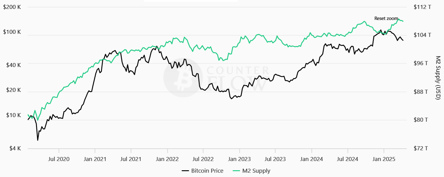 Bitcoin/USD (left) vs. M2 global money supply. Source: BitcoinCounterFlow