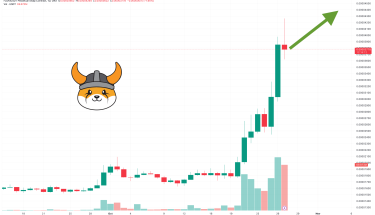 The Floki price has rocketed by 25% in the past 24 hours, with its surge to $0.00003824 coming as the wider crypto market falls by 1.5% today.