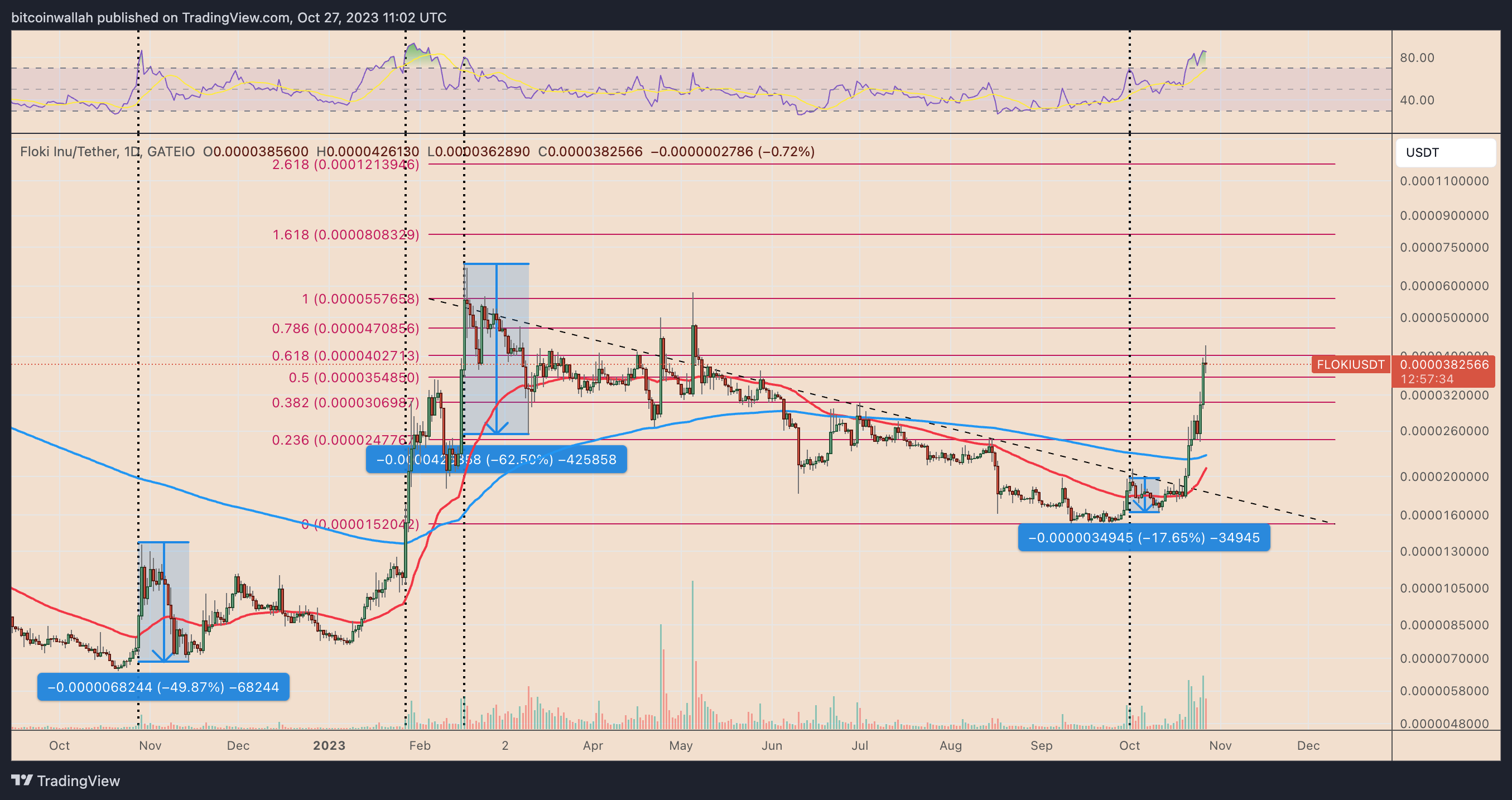 If FLOKI’s rally stalls, then the FLOKI/USD pair risks dropping toward its 0.5 Fibonacci retracement line near $0.00003548 in October 2023. A decisive close below the level may crash the price toward the 0.236 Fib line near $0.00003069 in November 2023, down 20% from the current price levels.